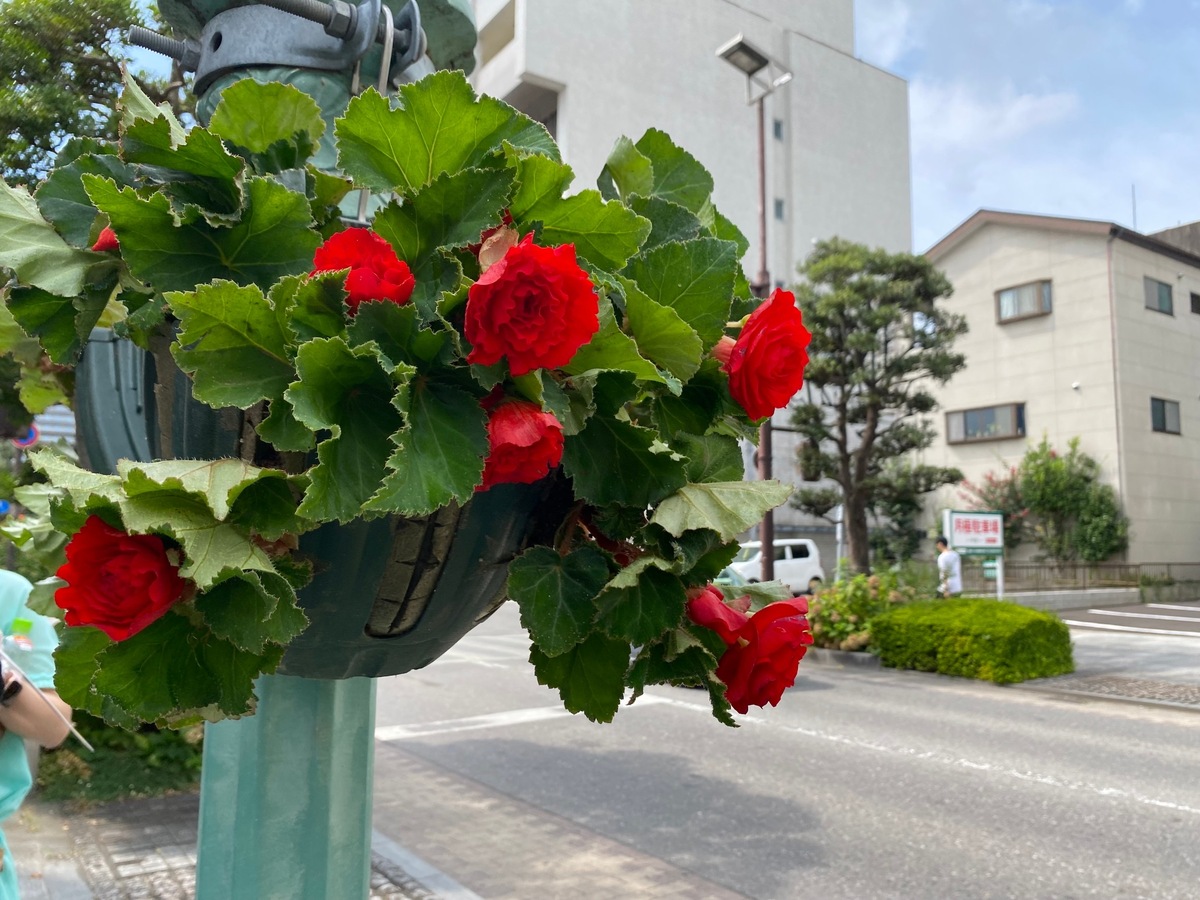 今回のお花は、赤色のフォーチュンベゴニアです。フォーチュンベゴニアは、大輪でバラのように八重咲する花姿が魅力的な球根ベゴニアです。宇都宮ブリッツェンをイメージして作られたハンギングバスケットで、シンボルロードと東武馬車道通りが鮮やかに彩られました。