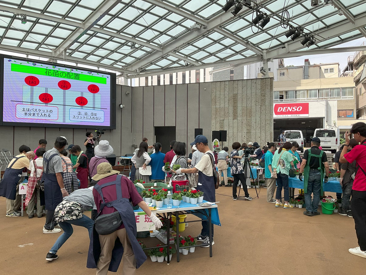 一般参加者や緑化ボランティア、栃木県立白楊高等学校農業経営科の皆さん、合計68名のたくさんの方にご協力をいただき、92基のハンギングバスケットを作りました。