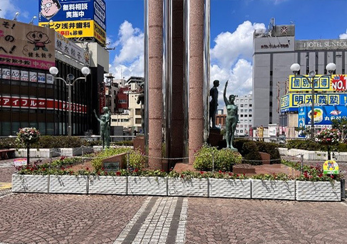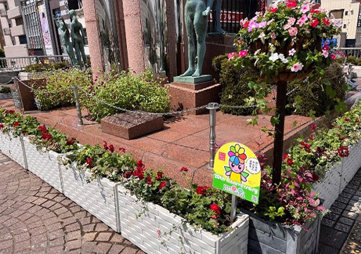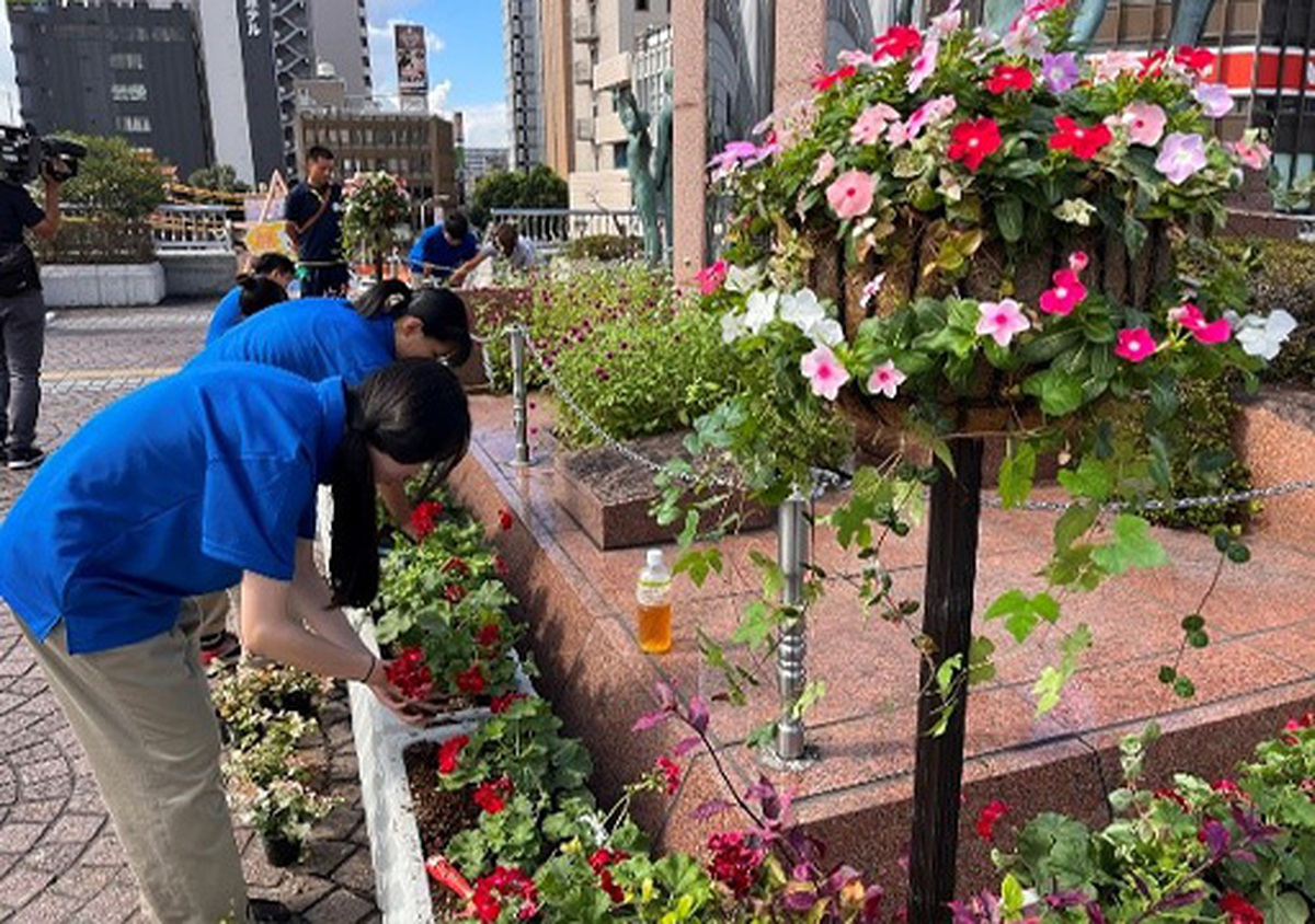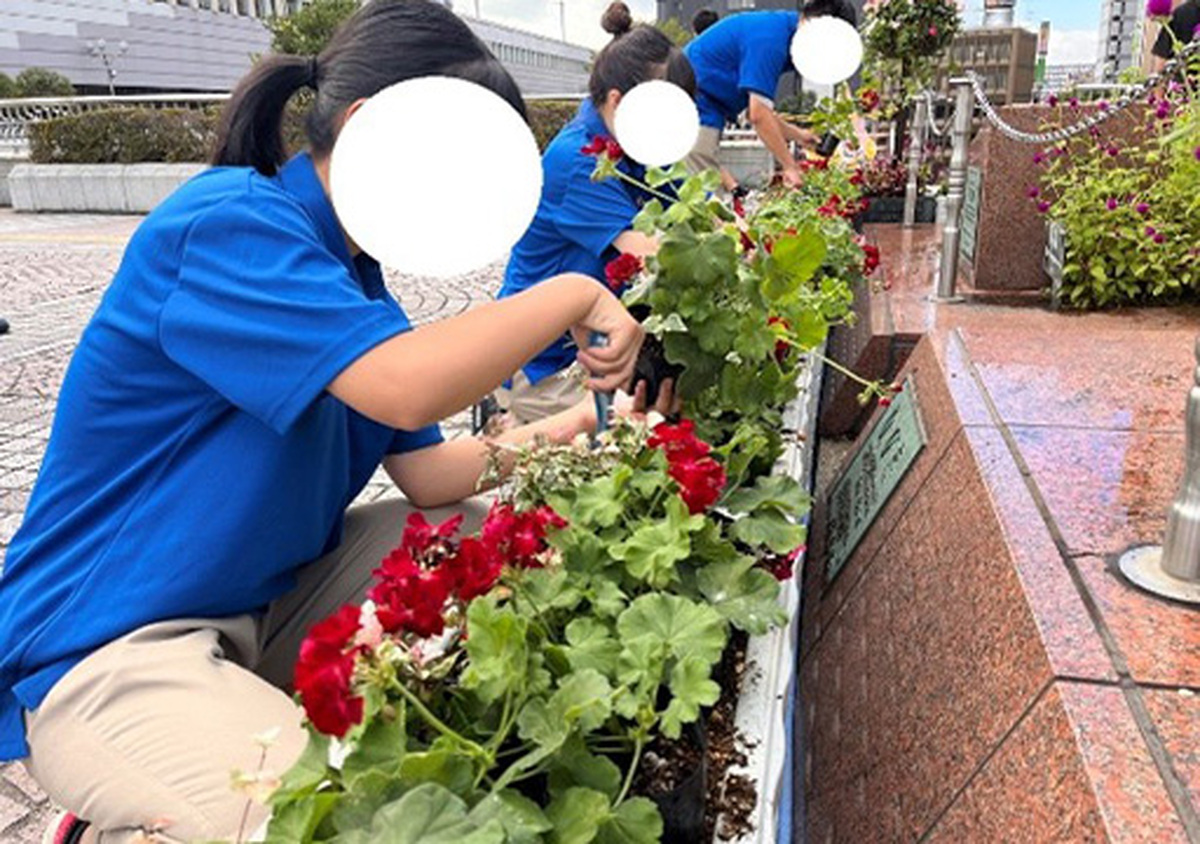 令和5年8月24日(木)、栃木県立白楊高等学校草花分会の3年生6名によって、真っ赤なゼラニウムと初雪カズラが16基のプランターに植栽され、2基のスタンディングバスケットと共にJR宇都宮駅西口ひびき像前を華やかに彩りました。