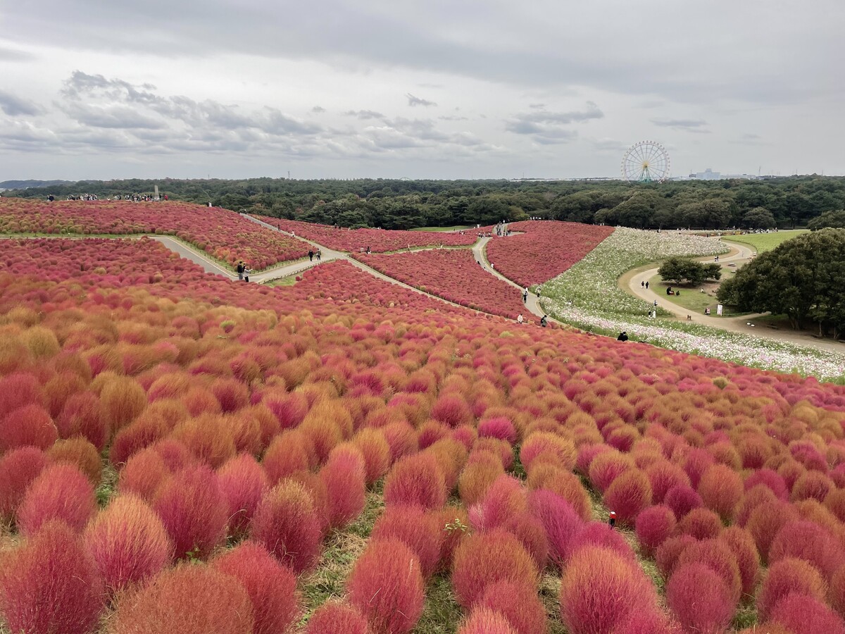 ひたち海浜公園では,丘一面に咲き誇るコキアが紅葉し,息をのむほどでした。