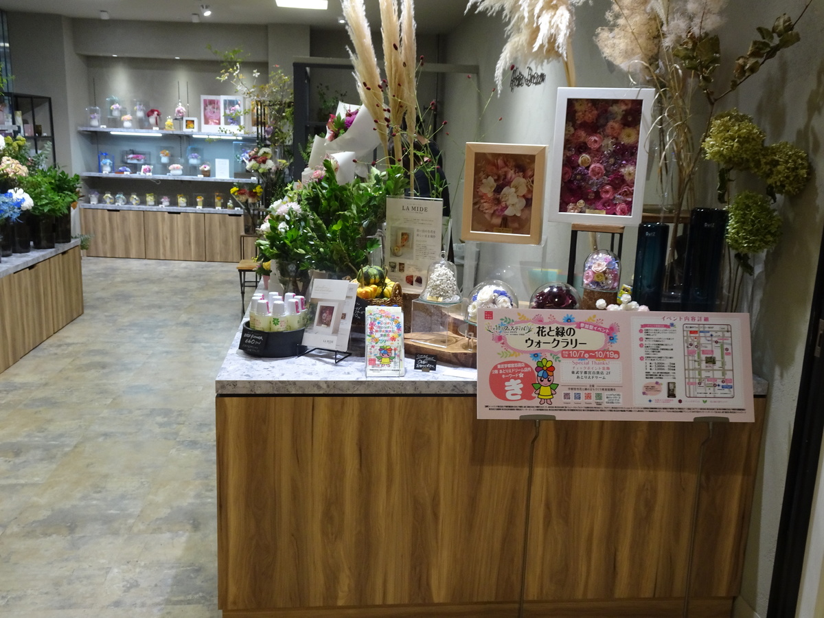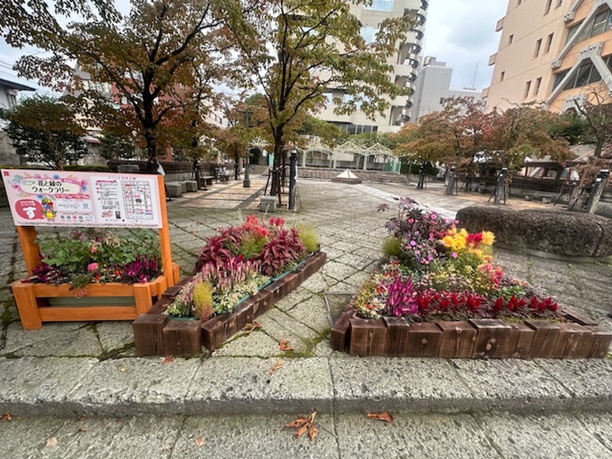 「花と緑のウォークラリー」では、釜川ふれあい広場、ミハシカフェ前、宇都宮城址公園北側入口、宇都宮城址公園おほり橋付近、宇都宮市役所北側バス停横、まちかど広場、今年は新たに東武宇都宮百貨店2階「あとりえドリーム」店内の計7箇所で行いました。またチェックポイントを結ぶ動線区間として、釜川プロムナード、みはし通り、本丸通り、みどりの小径、シンボルロードも彩りました。