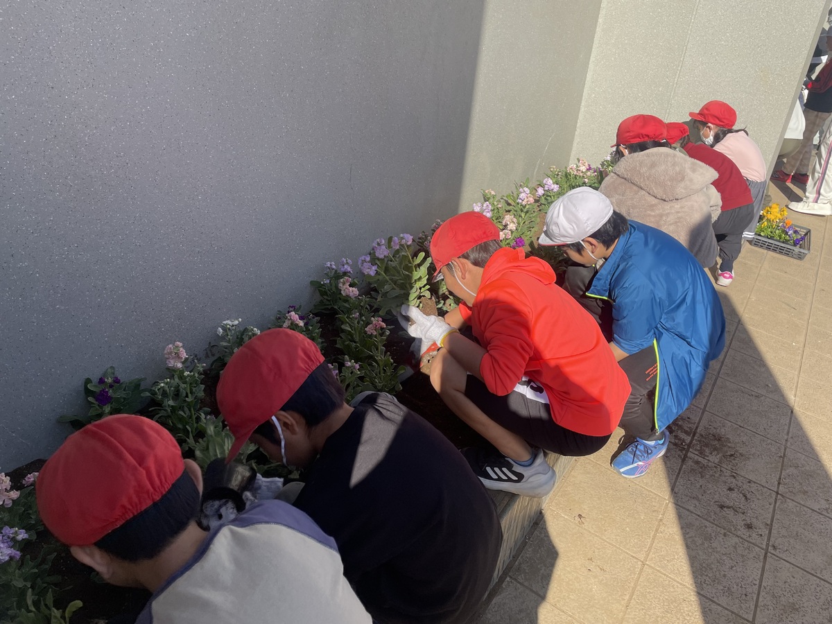 快晴のなか,児童皆さまの頑張りにより,予定通りに植えることができました。